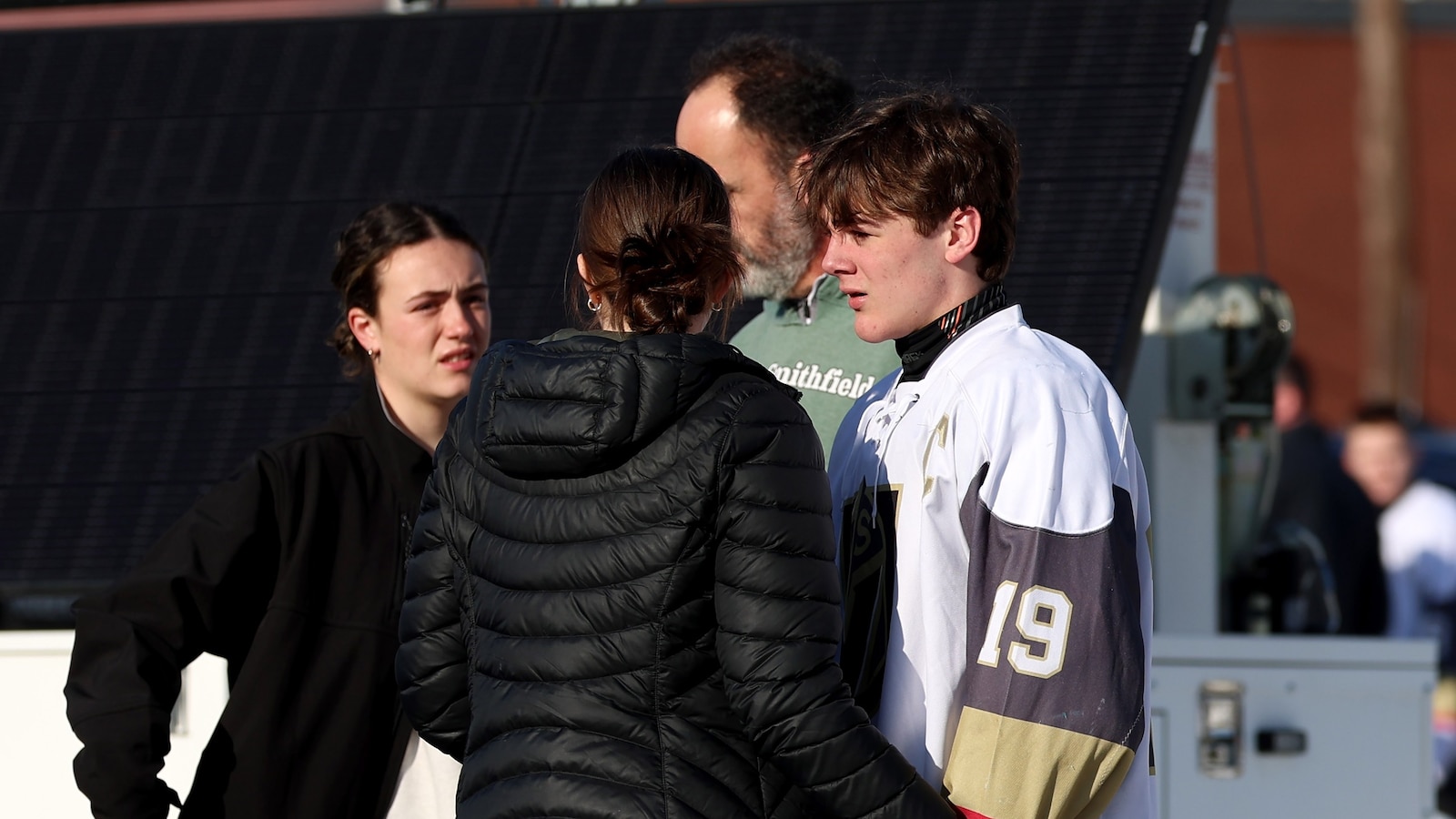 Parents and players congregate near the Lynch Arena in Pawtucket, R.I., after a shooting at the ice rink, Feb. 16, 2026.