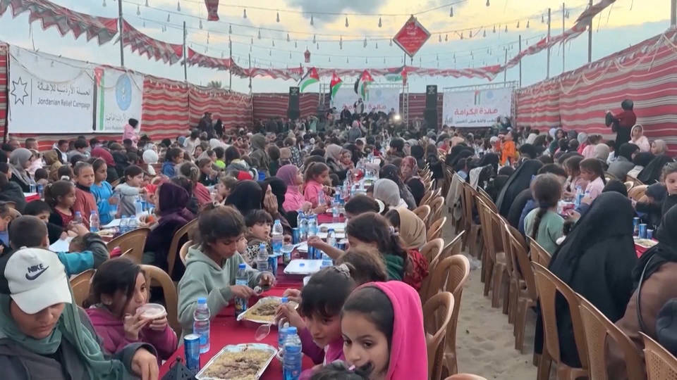Palestinians in Gaza are observing the holy month of Ramadan amid Israel’s attacks and near-total blockade on food and humanitarian aid. Families have gathered across Gaza for Iftar, a meal at sunset to break the daily fast. This is Reda Abu Taima, speaking from a camp in Khan Younis for orphaned children.