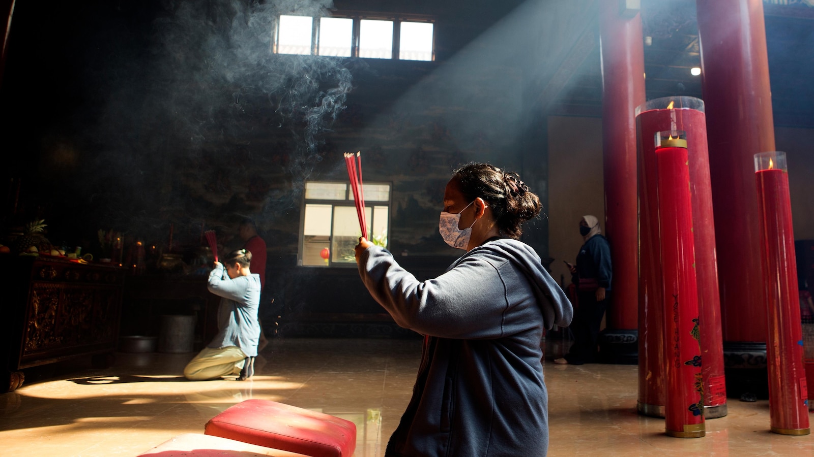 Incense smoke wafted into the air at a temple in Hong Kong where people line up every year to make wishes for the new year at midnight.