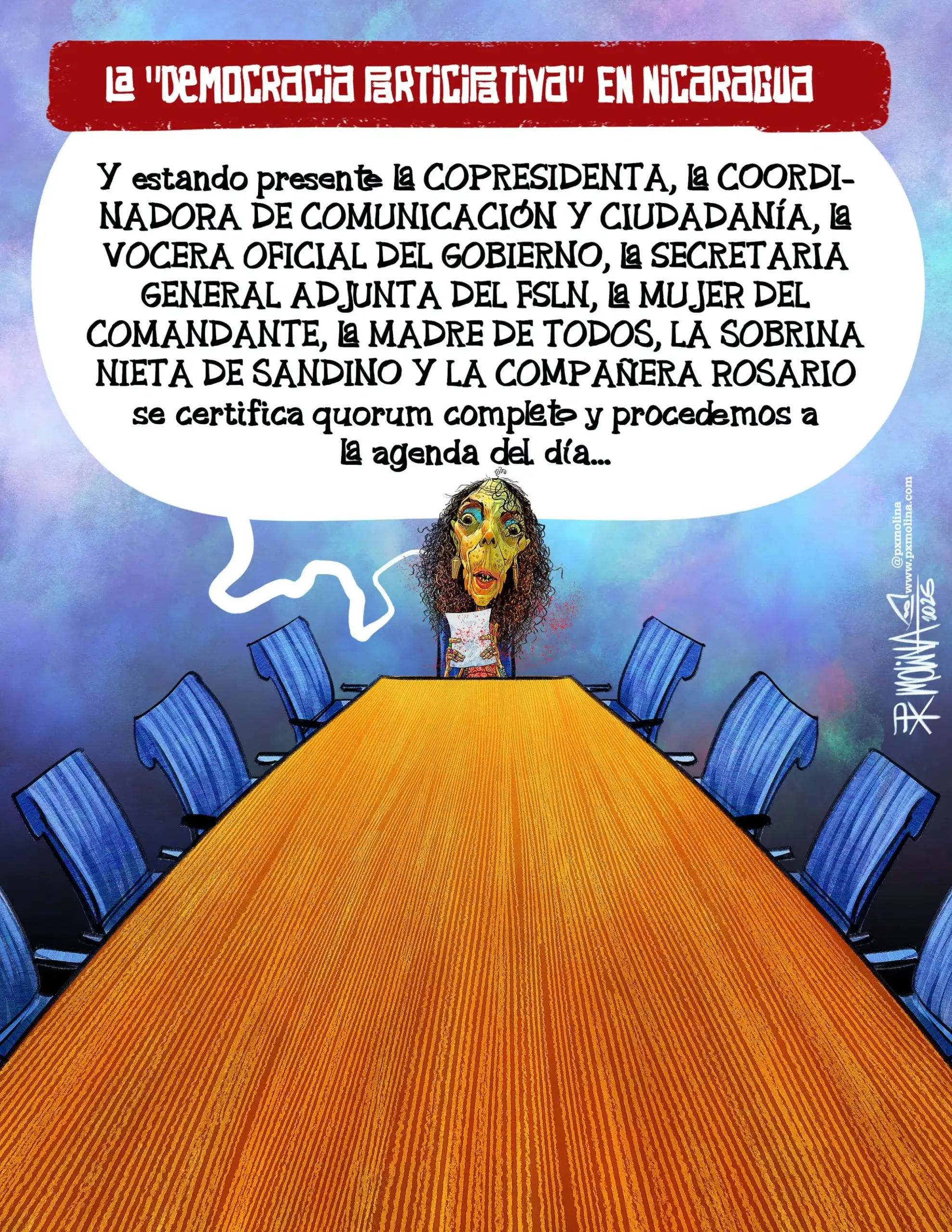 This cartoon by PxMolina illustrates what the Murillo-Ortega family dictatorship consider a participatory democracy.